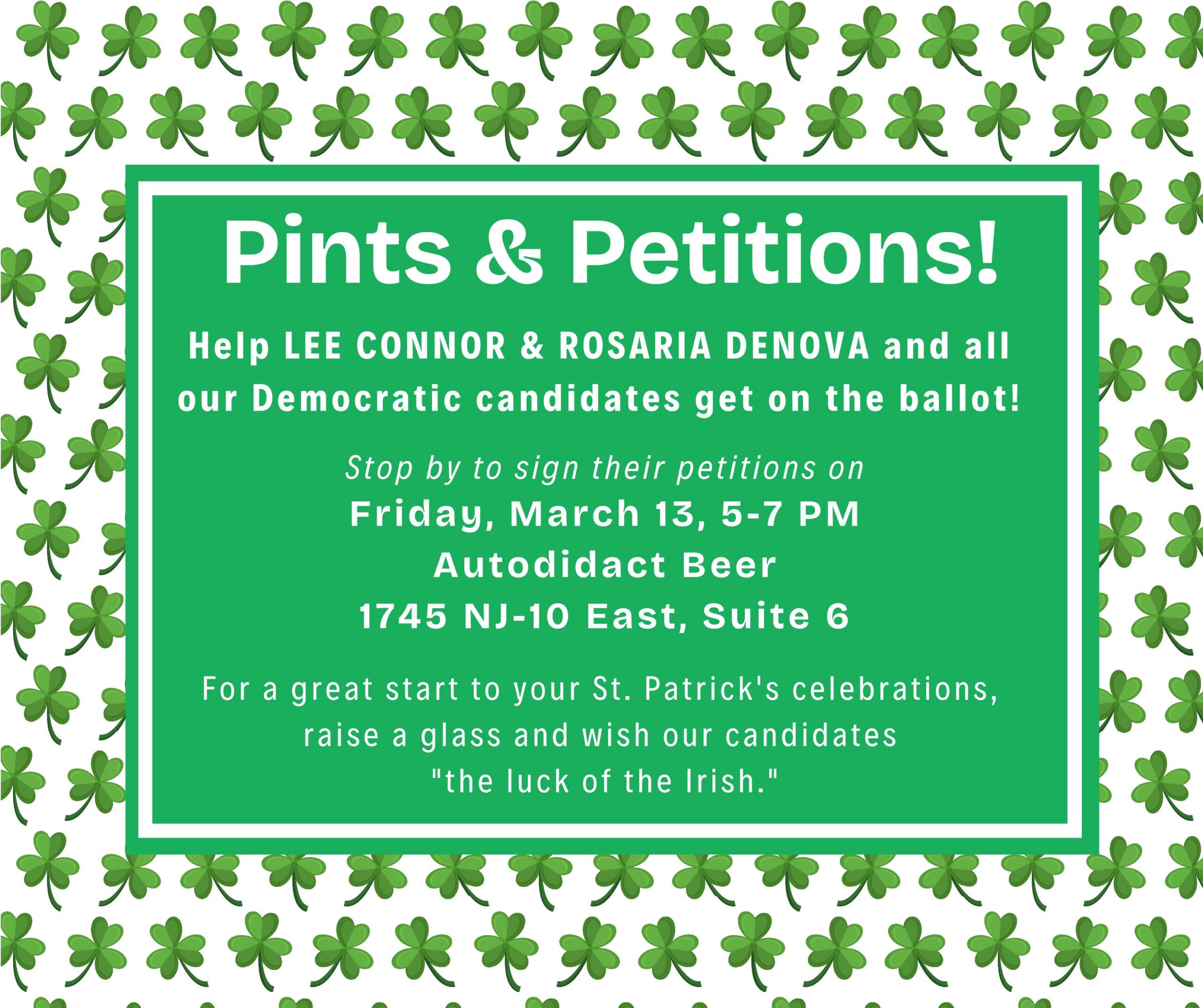 Start your Saint Patrick Day's celebrations by stopping by Friday, March 13 from 5-7 PM at Autodidact Beer to sign Lee Connor & Rosaria DeNova's petition for Morris Plains Borough Council and to wish them the luck of the Irish! Petitions for Chris Russo for Morris County Commissioner and Analilia Mejia for Congress will also...